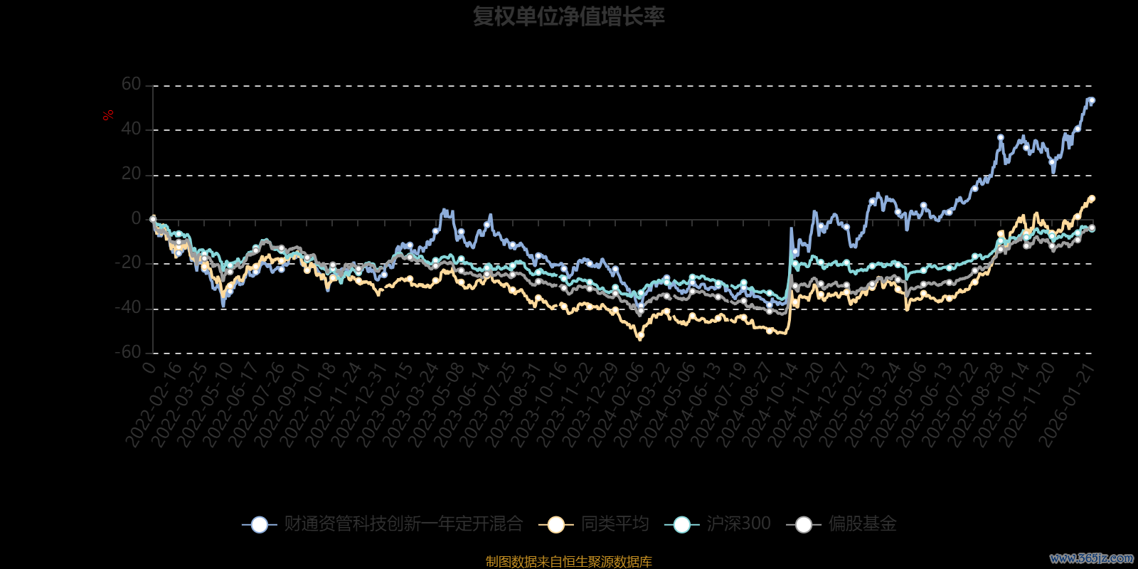 截至1月21日,财通资管科技创新一年定开混合近三个月复权单位净值增长率为16.99%,位于同类可比基金68/229;近半年复权单位净值增长率为34.68%,位于同类可比基金164/229;近一年复权单位净值增长率为62.60%,位于同类可比基金107/222;近三年复权单位净值增长率为75.69%,位于同类可比基金50/165。